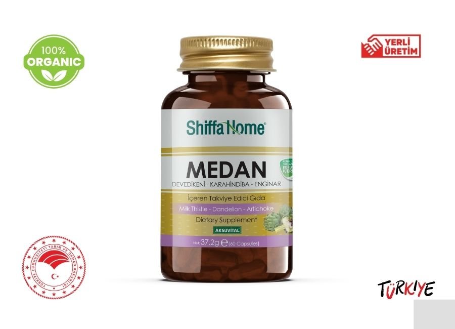 Medan kapsül içinde Karahindiba Toprak Üstü 600 mg, Devedikeni Tohumu 375 mg, Bitkisel Kapsül, Enginar Yaprağı 375 mg, Devedikeni Tohumu Ekstresi 75 mg bulunduran, tamamen doğal ürünlerin yüksek teknolojiyle bir araya getirildiği, sizi daima güçlü hissettirecek gıda takviyesidir.  Doğal ürünler insan kimyasıyla tam uyumu sebebiyle sağlıklı yaşamın anahtarıdır. Kapsüllerimiz tamamen bitkisel kökenlidir. Hayvansal hiçbir bileşik içermez. Midede 8-10 dakika içerisinde çözünmektedir.
