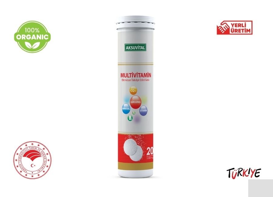 AksuVital Multivitamin, Koenzim Q10, B1, B2,B6 B12 Vitaminleri, C Vitamini, D Vitamini, E Vitamini, Biotin, Selenyum, Çinko, Demir, Bakır, Ginseng ve Folik Asit içeren özel bir enerji formülüdür. Ve insanın günlük alınması gereken enerji miktarına katkıda bulunur.