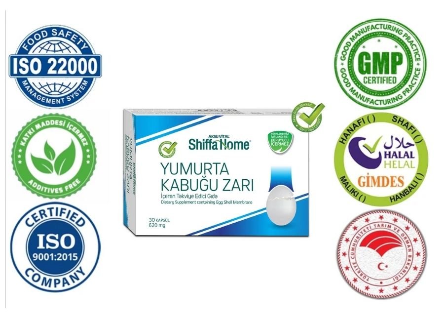 İçerik: Hidrolize Yumurta Kabuğu Zarı 500 mg (Protein 300 mg), Bitkisel kapsül.